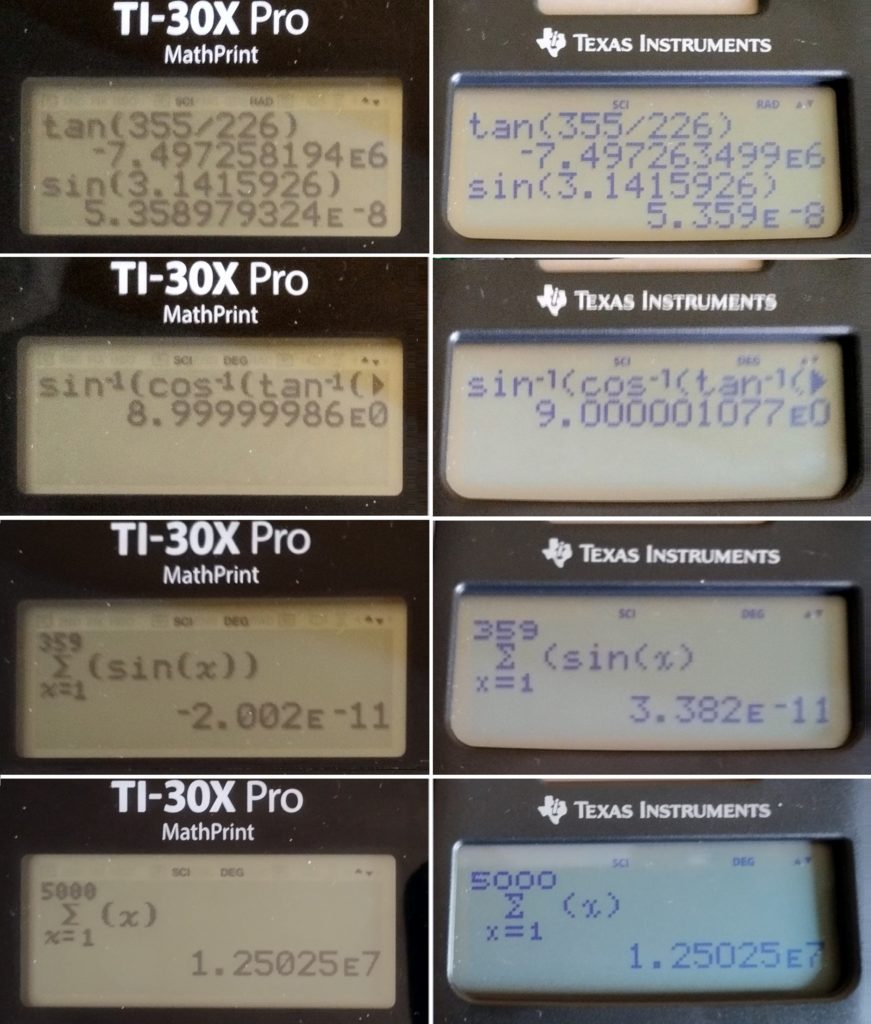 Pour rendre justice à la TI-83, observons cette expérimentation avec d’autres nombres source que le traditionnel « 9 » du test Forensics, avec toujours comme référence les résultats d’un SHARP PC-1280 commuté en mode double précision :