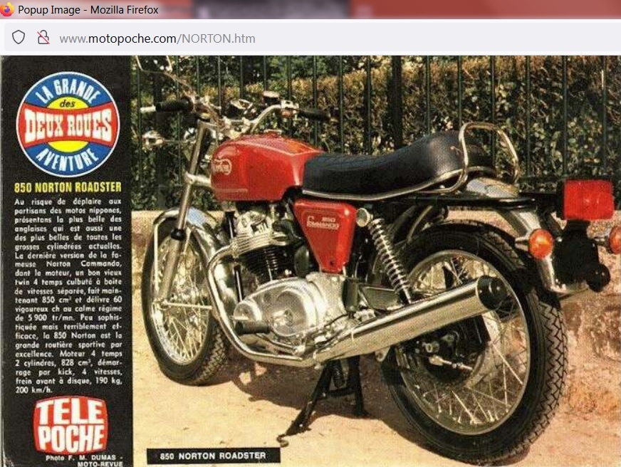 La moto devint une passion obsédante. Je tentais de construire des maquettes avec ciseaux et carton, elles n’étaient guère réussies. Je contemplais à n’en plus finir les images de Télé-poche qui s’accumulaient. L’une d’elles montrait une Norton Roadster « Commando » 850. La machine était photographiée de trois-quarts, de sorte que sa forme globale n’était pas bien décelable, laissant à l’imagination le loisir d’y dessiner la plus belle moto qui ait jamais été conçue. Je connaissais par cœur le paragraphe qui la décrivait et dont je comprenais peu de choses. Qu’était-ce qu’un culbuteur, à quoi servait un cylindre au juste ? et un kick de démarrage ? Internet n’existait pas. Cette Norton de couleur rouge vermillon – restée depuis lors ma couleur préférée – deviendra mon but ultime, celui de la voir de mes yeux, de la posséder un jour, de sillonner de la plus belle façon les rues et les routes de mon village …