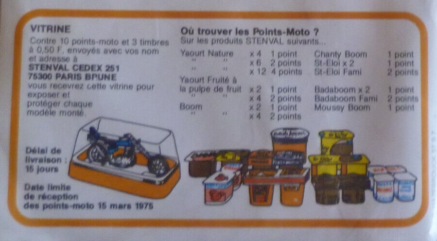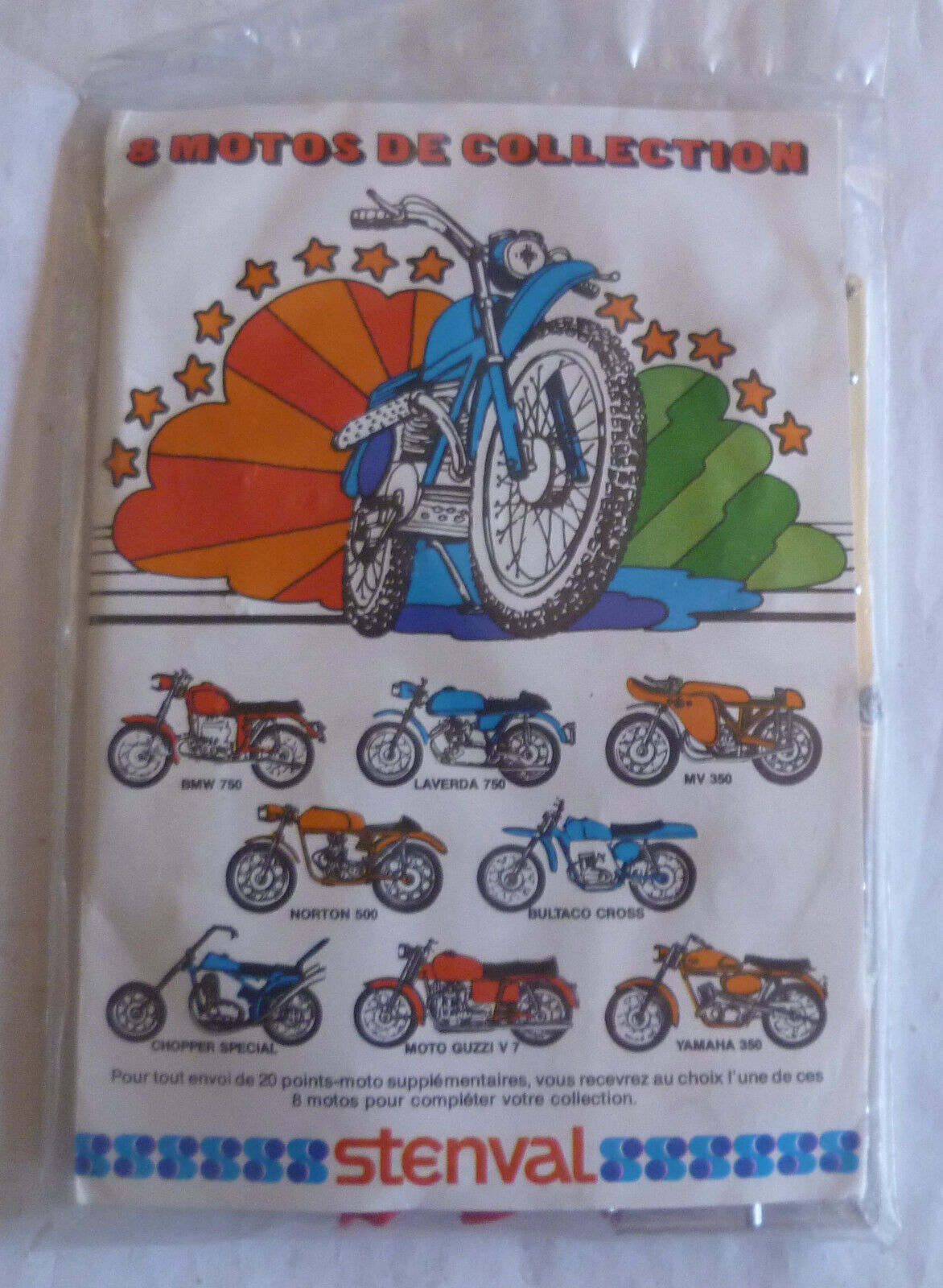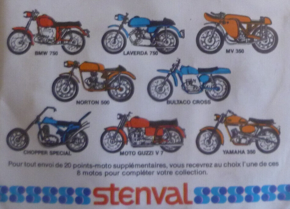 Je n’ai jamais complètement oublié l’offre des yaourts Stenval et leurs points à découper. Les souvenirs étaient bien fugaces quand, cinquante ans plus tard je vis passer les images ci-dessous sur internet. Comment la personne qui les y avait déposées avait-elle pu les extirper d’un aussi lointain passé ? Tout me revint en mémoire, en particulier les différents modèles proposés. Il y avait la Moto Guzzi bien sûr, et aussi la Laverda 750, une Norton – pas celle de mes rêves – et une très bizarre Chopper américaine. Une date était lisible : le 15 mars 1975, date limite d’envoi des points.