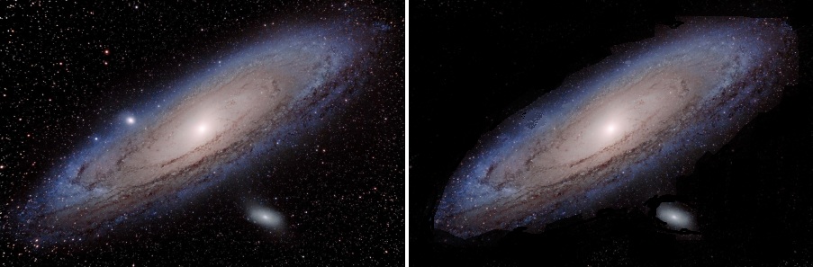 Si l’on regarde maintenant l’image de Google Earth on comprend que toutes les étoiles visibles dans le champ appartiennent certes à l’univers, mais plus prosaïquement ont en commun de toutes appartenir à notre Galaxie à l’intérieur de laquelle nous sommes plongés, tandis que le point étalé correspond à la galaxie d’Andromède, pourtant apparemment sur un même plan, mais incommensurablement plus loin et des milliards de fois plus étendue qu’une simple étoile.